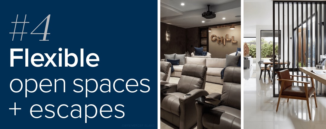 Open floor plans still reign supreme (even post-quarantine), but all that working from home has made us think about how we can make our spaces more adaptable. Pocket doors, decorative screens, and kitchen islands are being seen as a way to create some division without permanently disrupting flow or line of sight.